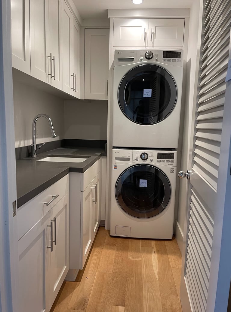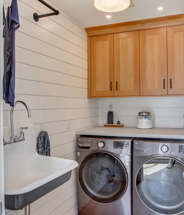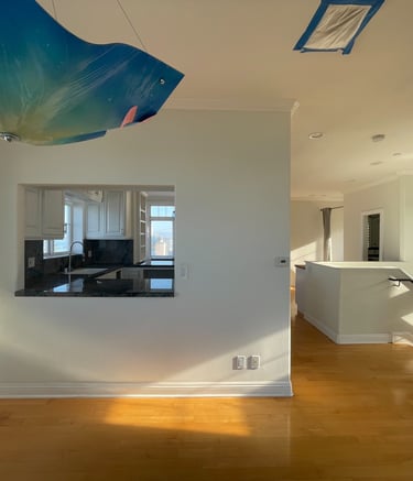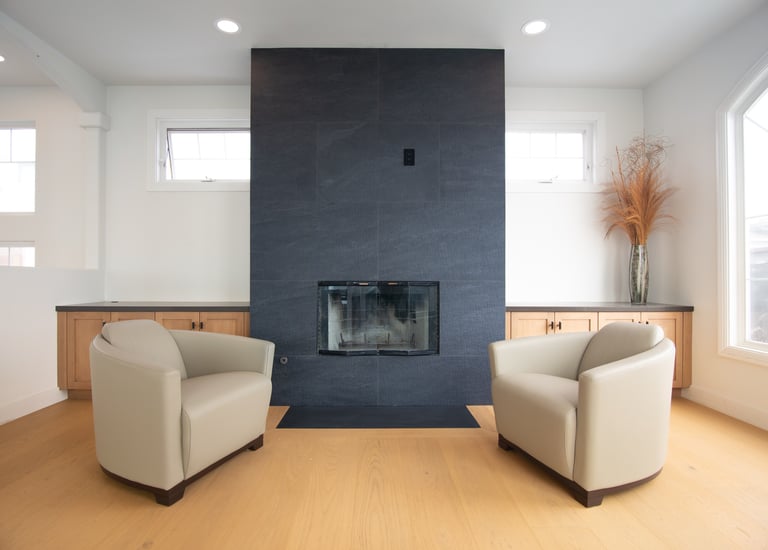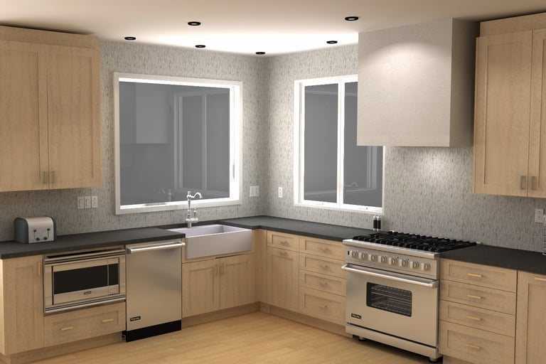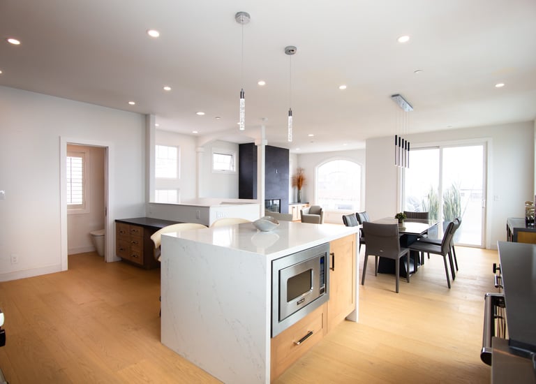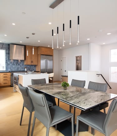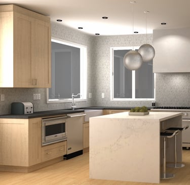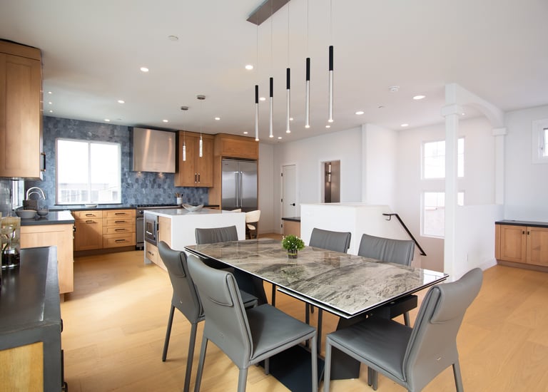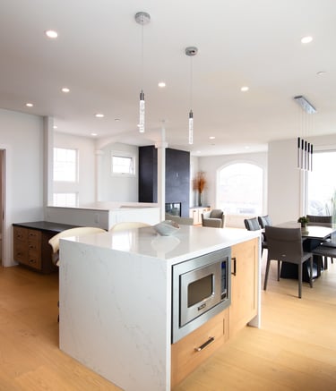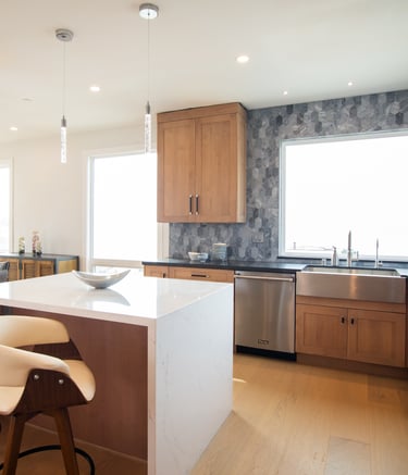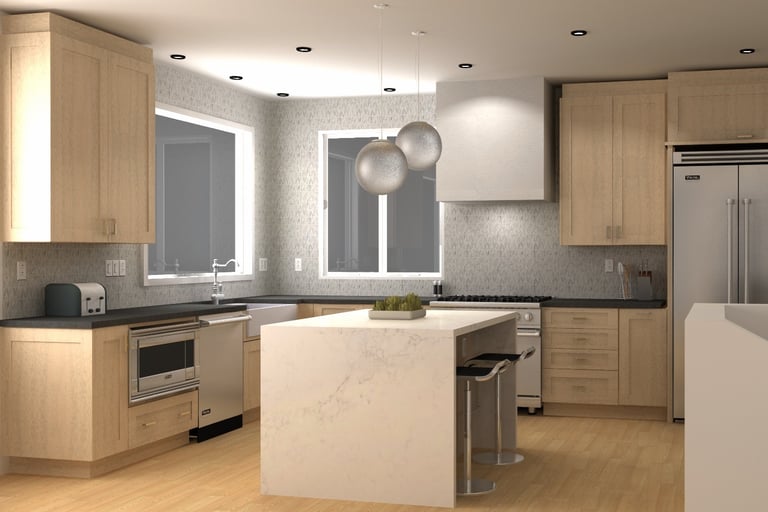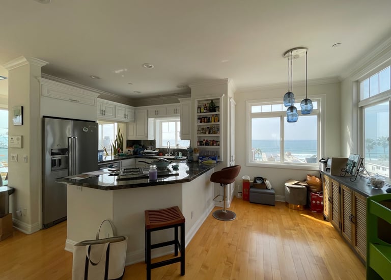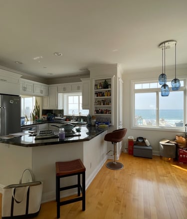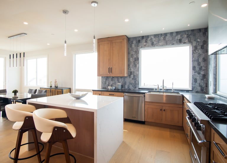 RemodelUp transforms the space by opening up the room and enlarging the windows. Without compromising the structural integrity of the building, removing the wall in between the kitchen and the dining room, the space is maximized to the fullest offering endless view of the ocean. Using Greenfield Cabinetry in Alder wood Augusta door style, engineered quartz counter top, marble tile full height backsplash and stainless steel appliances.