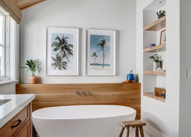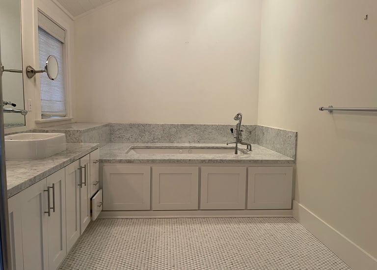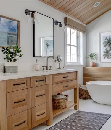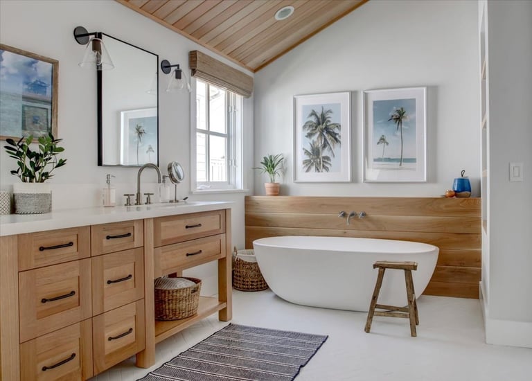 From a sterile and cold white Carrara marble bathroom, RemodelUp creates a warm, natural and inviting oasis for our clients. Custom cabinets by Greenfield Cabinetry in quarter sawn White Oak wide rail Jamieson shaker door in natural matte stain. Engineered quartz counter top, VG fir on the sloped ceiling, White Oak tub ledge, ceramic floor in herringbone pattern, Moroccan zellige tiles in the shower, bathroom fixtures from Newport Brass and Hydrosystem for the freestanding tub. Mirrors and sconces from Restoration Hardware and Crate and Barrel, respectively.