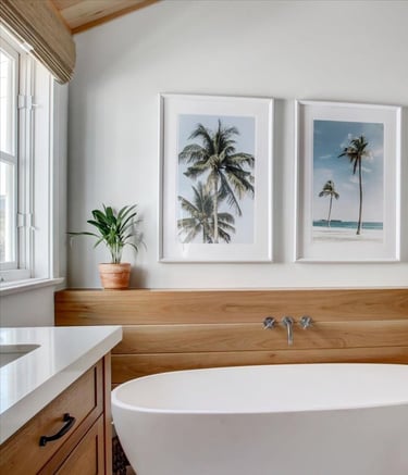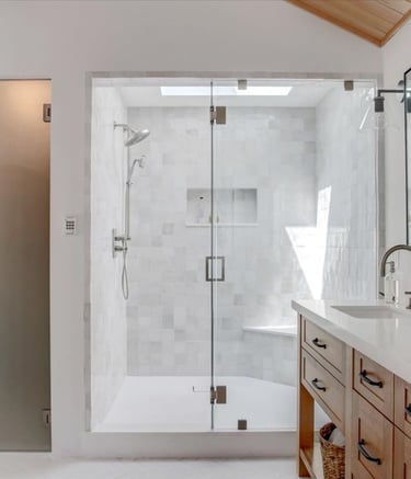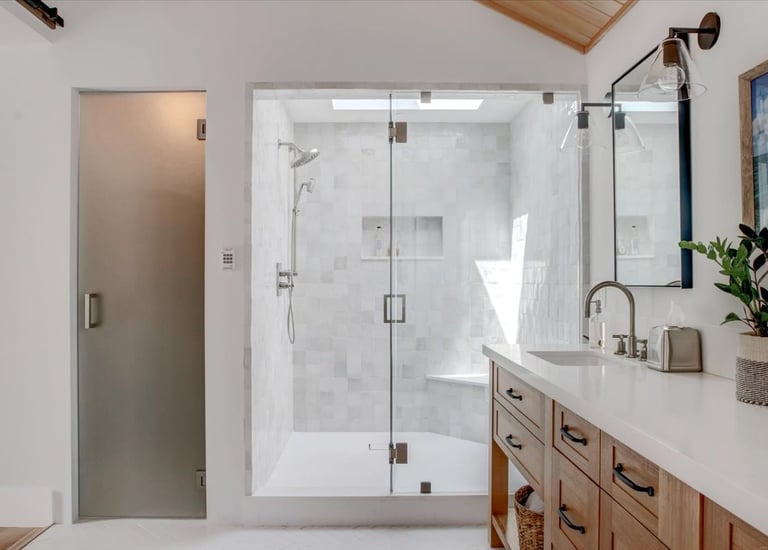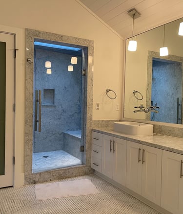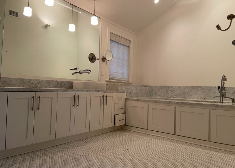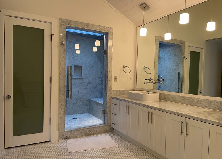 To design the bathroom with a sloped ceiling is one of my favorite challenge to tackle. Instead of leaving it bare with paint, I clad the ceiling with VG Fir bringing all the wood elements and drawing the eyes upward making the room spacious and grand.